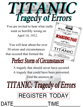 I thought the Titanic program was great. There was nothing I didn't like. I thought the entire performance was informative, well researched, and nicely executed. I hope to work with you again.There was a wealth of information presented. This was a well researched and presented program. I would highly recommend this to other public libraries. It was a nice mix of lecture and audience participation. ~Kathryn Clewell - Adult Librarian - Columbiana Public Library