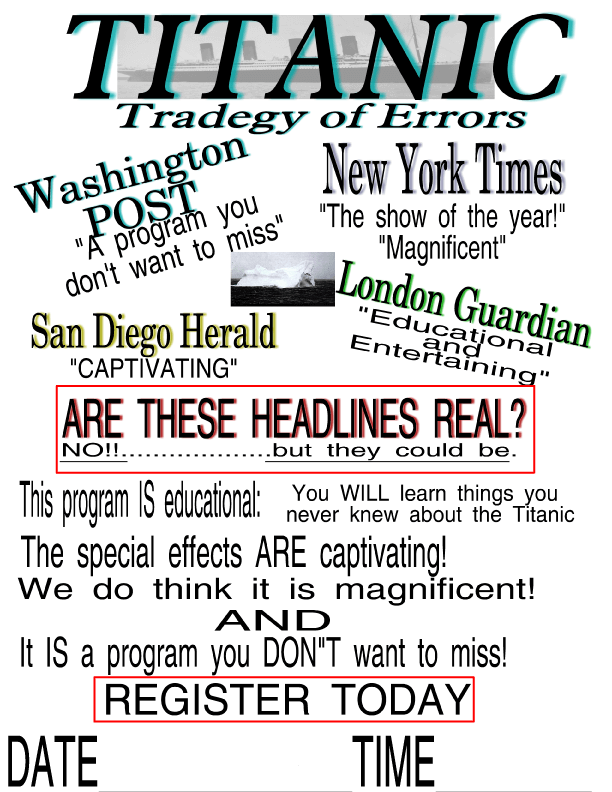 I thought the Titanic program was great. There was nothing I didn't like. I thought the entire performance was informative, well researched, and nicely executed. I hope to work with you again. ~Jennifer Cesta- PR Coordinator- Public Library of Steubenville and Jefferson County